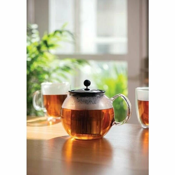 Der optisch ansprechende Teebereiter Assam mit einem Fassungsvermögen von 1 l aus dem Hause Bodum ist aus bruchsicherem Glas gefertigt, das in der Spülmaschine gereinigt werden kann. Der schöne Edelstahlfilter, der im Inneren der gefüllten Kanne schimmert, ist chromfarben gestaltet. Mit einem Volumen von einem Liter ist dieser Teebereiter sowohl für heißen Tee an kalten Tagen als auch für Eistee im Hochsommer geeignet. Tee gelingt mit dieser Kombination aus Kanne und Filter sowohl mit Teebeuteln als auch mit losem Tee.